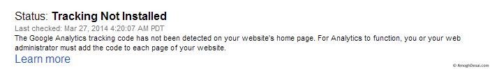 So to conclude, If you are getting an error “Status: Tracking not installed” in Google analytics, regardless of any platform (blogger, wordpress, etc.) make sure you are using naked domain in GA Property settings (domain name without the www) and Insert your code properly, make sure Realtime reporting is happening, and wait for couple of days (overnight for me !) for Google to take the error off.