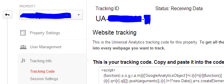 You can get this old code from Google’s help section. I added this code into my website <head>section. After adding the code I went back to the Admin section of GA and under Property selected Tracking Info, and under the Tracking Code section It showed me a big error: