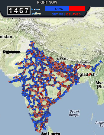 There are around 10,000 trains operating in India everyday and currently 6,500 of them are being tracked by this system. This system has a colour code to show if the train is running on time or is delayed. A train with Red color code is delayed and with a blue code is the one on scheduled time. Clicking on the train shows you a pop-up with further information about the current location, previous and next station, schedule status, etc.